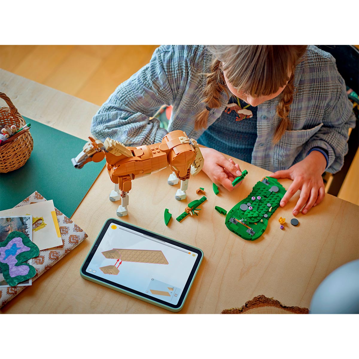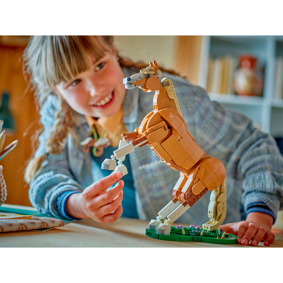 Los niños y las niñas disfrutarán de divertidas historias llenas de amor por los animales con el kit de construcción Caballo Noble (31166). El caballo de juguete articulado mueve la cabeza, el cuello, la grupa, los tobillos, la cola y una de las rodillas, y viene con una base con efecto de hierba donde los peques podrán exponerlo en 3 posturas: apoyado sobre 3 o 4 patas, o erguido sobre las 2 traseras, como decoración para la estantería de sus dormitorios.