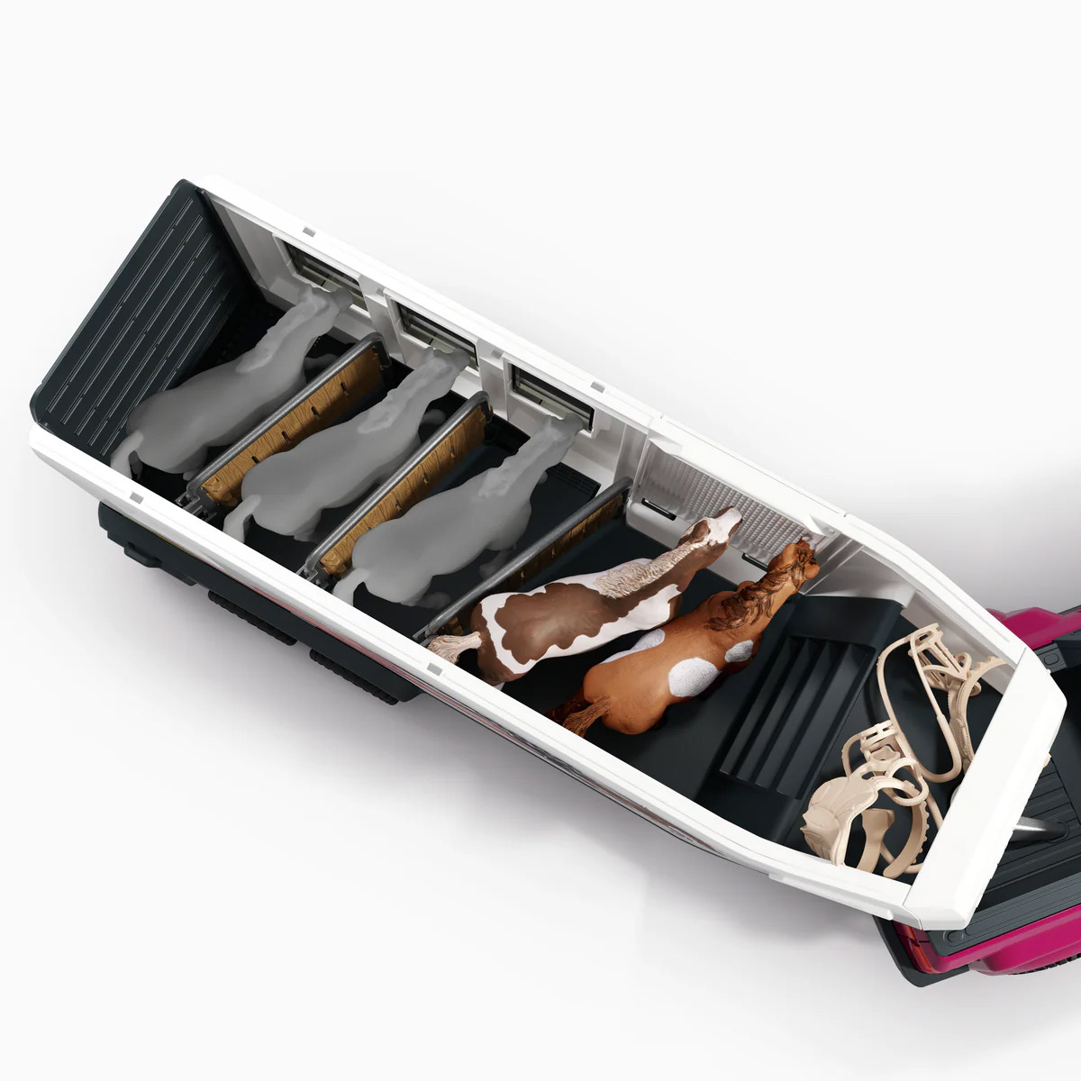 - Contenido: 1 camión, 1 remolque para caballos, 1 figura de Hannah, 1 figura de Mr. Kramer, 1 semental Quarter, 1 caballo capón Paint Horse, 1 labrador retriever hembra, 3 vallas para cuadras de caballos, 3 inserciones de madera, 6 barras blancas, 2 bridas y riendas, 2 sillas, 1 almohaza, 1 cepillo para caballos, 1 paca de heno, 1 zanahoria, 1 hueso para perros, 1 escoba, 1 cubo, 1 manguera, 3 barriles azules, 3 barriles rojos, 3 barriles blancos, 2 sombreros de vaquero, 1 pulsera roja, 2 hojas de pegatinas, 1 instrucciones de montaje