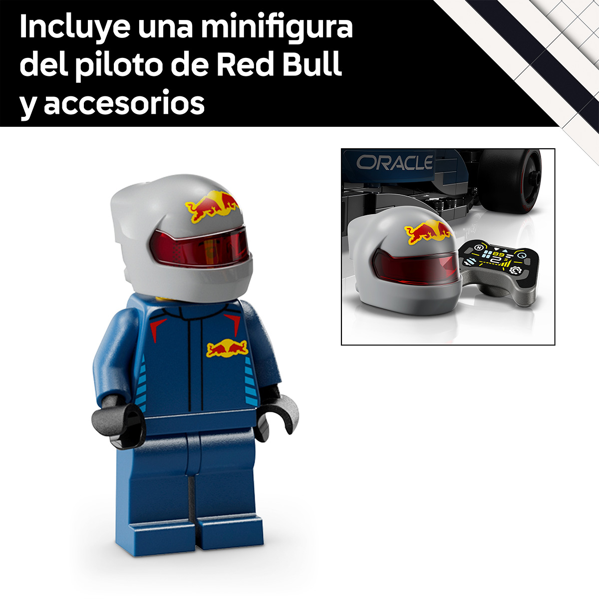 • Minifigura de F1®: Este kit incluye un vehículo y también una minifigura de un piloto de F1 con traje de competición de Red Bull y casco con alas para colocarla en el habitáculo del coche de carreras de F1
