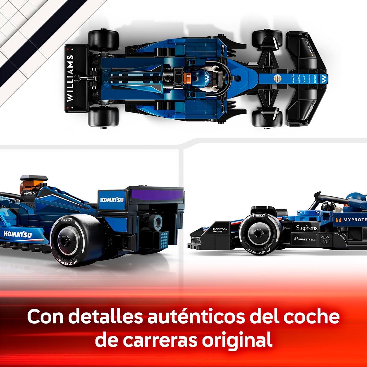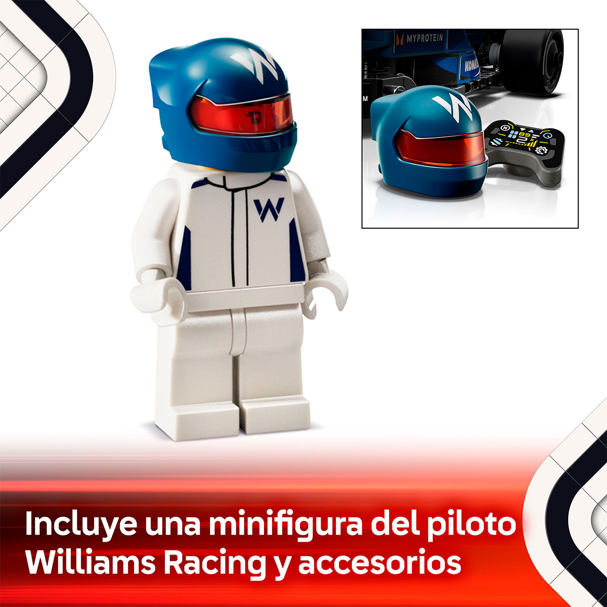 Este detallado coche de carreras LEGO reproduce con precisión el diseño del modelo que compitió en la temporada 2024 de Fórmula 1. El coche de fórmula 1 incluye también un habitáculo accesible al levantar el halo, un alerón trasero, suspensión de doble horquilla, pegatinas de los patrocinadores y neumáticos traseros con la inscripción «Pirelli». También trae una minifigura LEGO de un piloto con el uniforme oficial de Williams Racing y casco, lista para lanzarse a la pista.