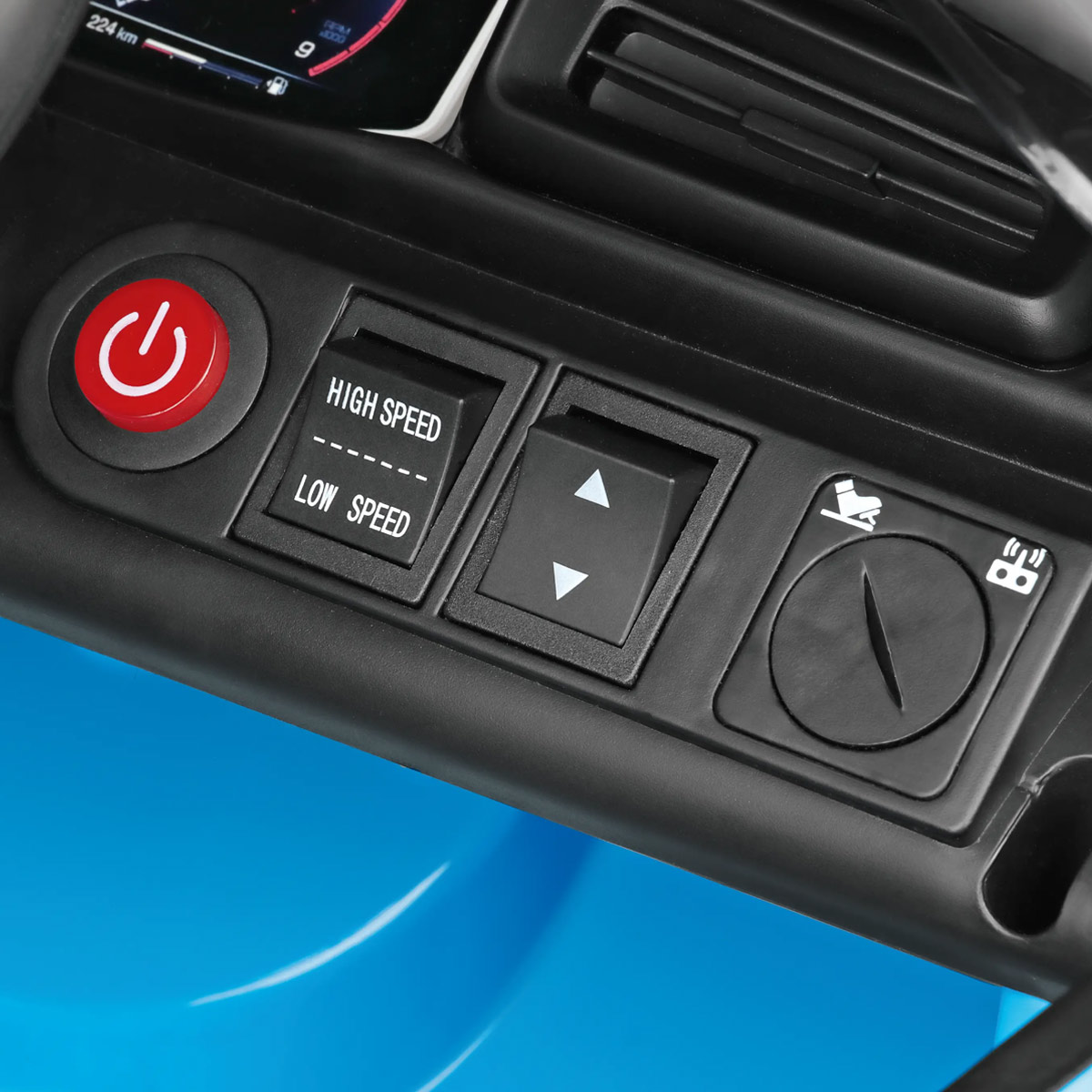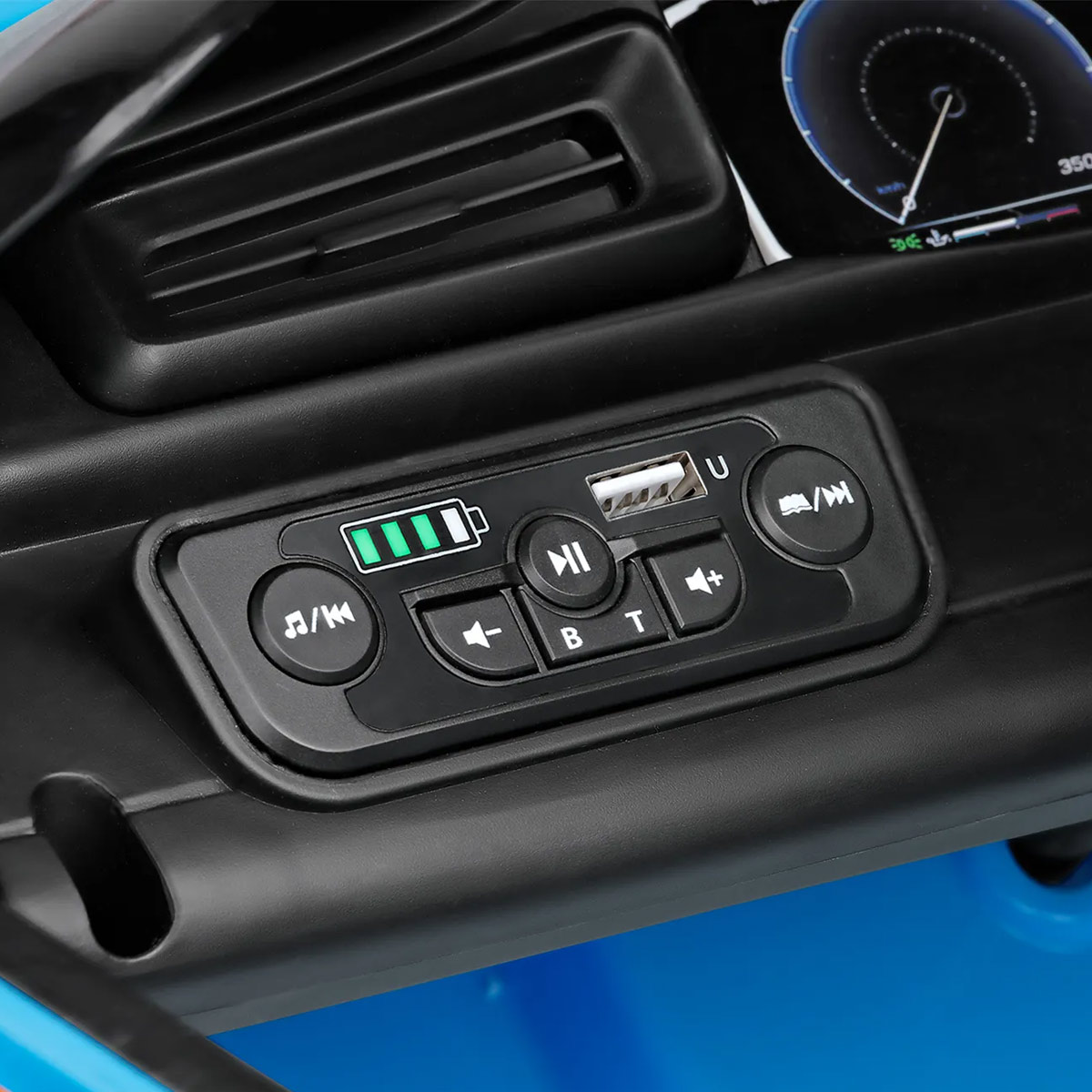 El salpicadero electrónico con botón ON/OFF incluye melodías pregrabadas y un puerto USB. Una franja de luces LED muestra el nivel de carga de la batería.