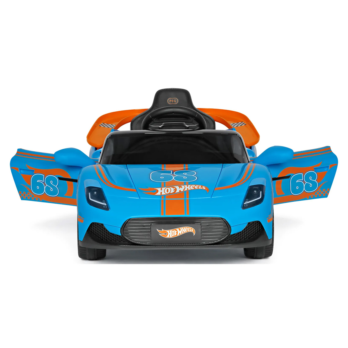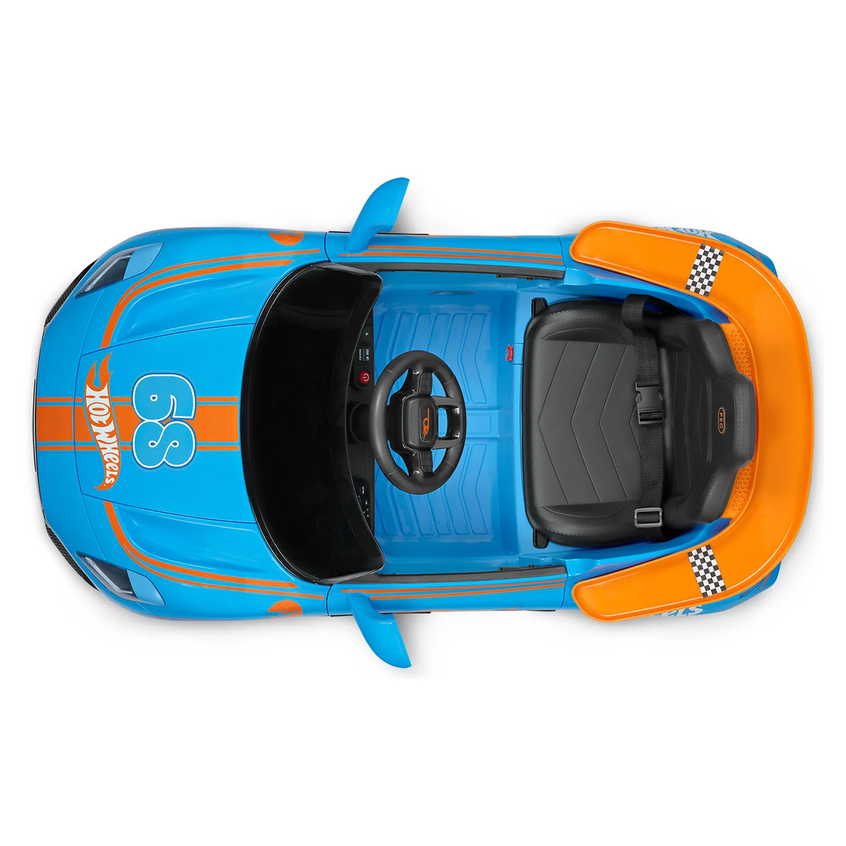 Equipado con batería de 12V, doble motor, luces LED multicolor y radio con música, ofrece una conducción dinámica y divertida en cada uso. Además, su alerón trasero se transforma en una pista integrada para coches Hot Wheels, añadiendo un extra de juego y creatividad.