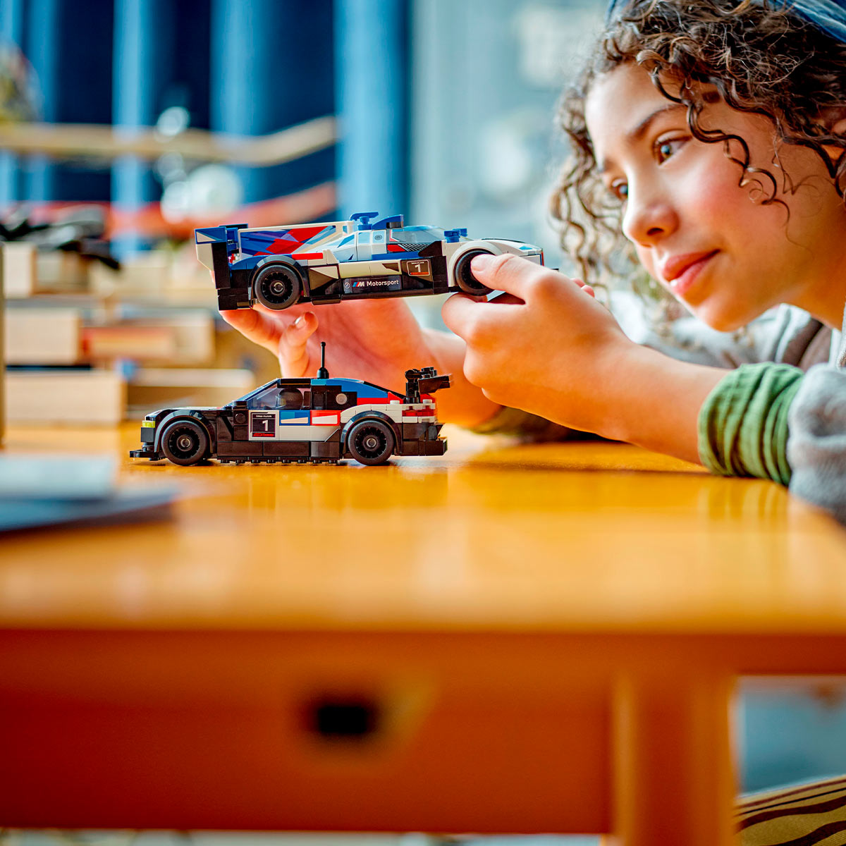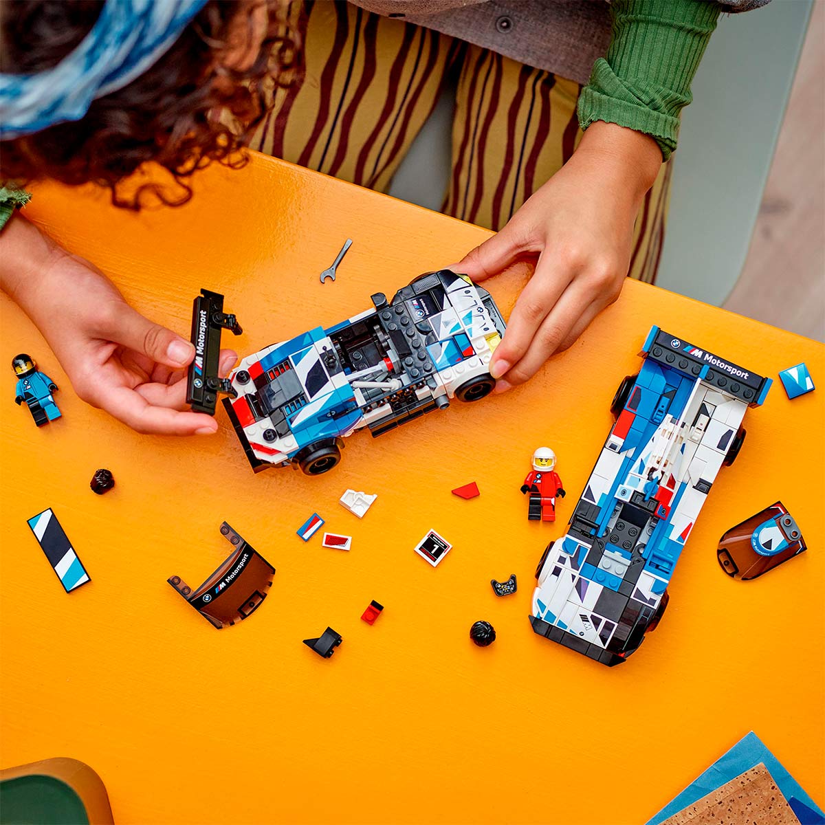 Las réplicas del BMW M4 GT3 y el BMW M Hybrid V8 incluyen fieles características de diseño de las versiones de la vida real, como los tubos de escape, los difusores, los alerones traseros, los colores distintivos de BMW M Motorsport y los detalles interiores. Estos coches de carreras de juguete cuentan con techo desmontable y vienen con una minifigura de un piloto cada uno.