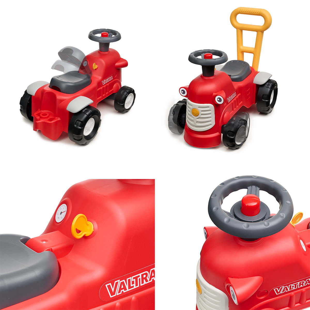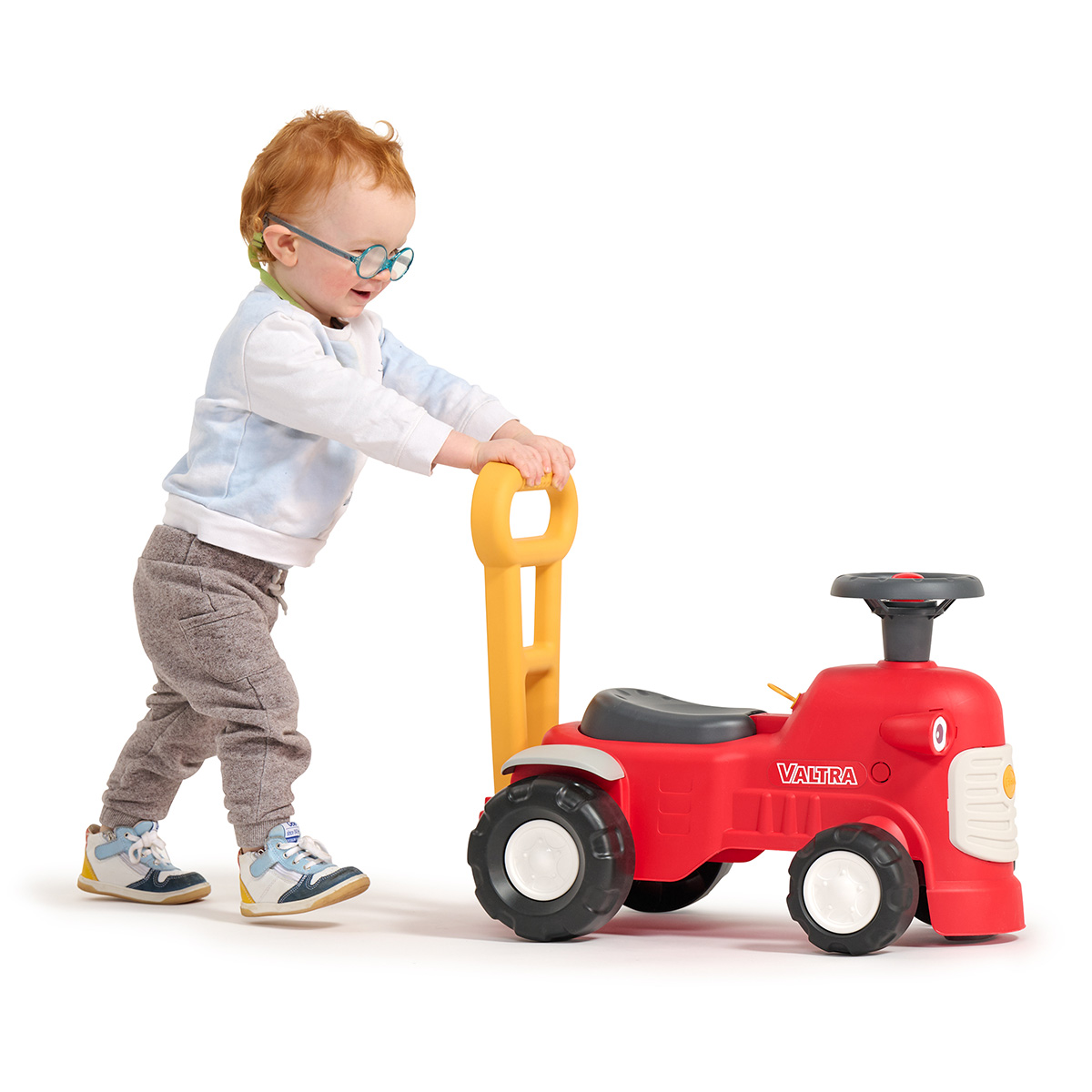 Un adorable tractor vintage Valtra, lleno de ingenio y encanto, que acompañará a tu hijo desde los 12 meses hasta sus primeros pasos, gracias a su barra ergonómica para aprender a caminar.