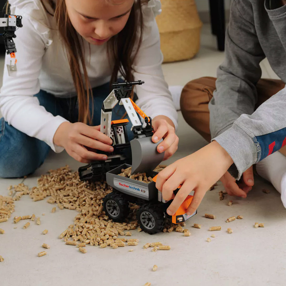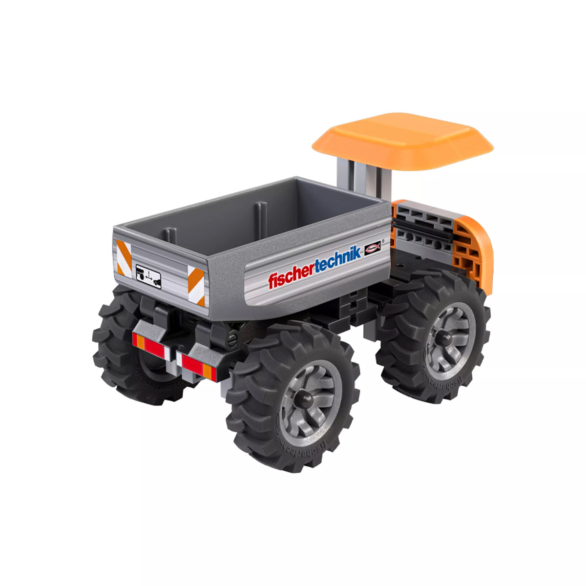 • El camión Fischertechnik con caja de carga basculante transporta cargas pesadas de forma segura por la obra.
