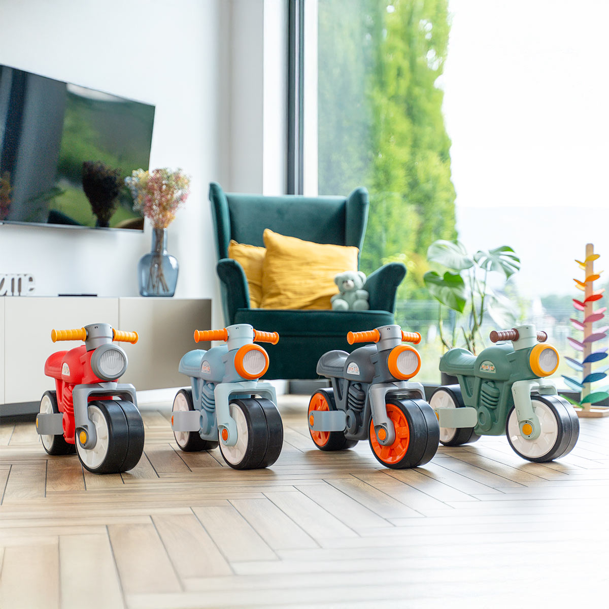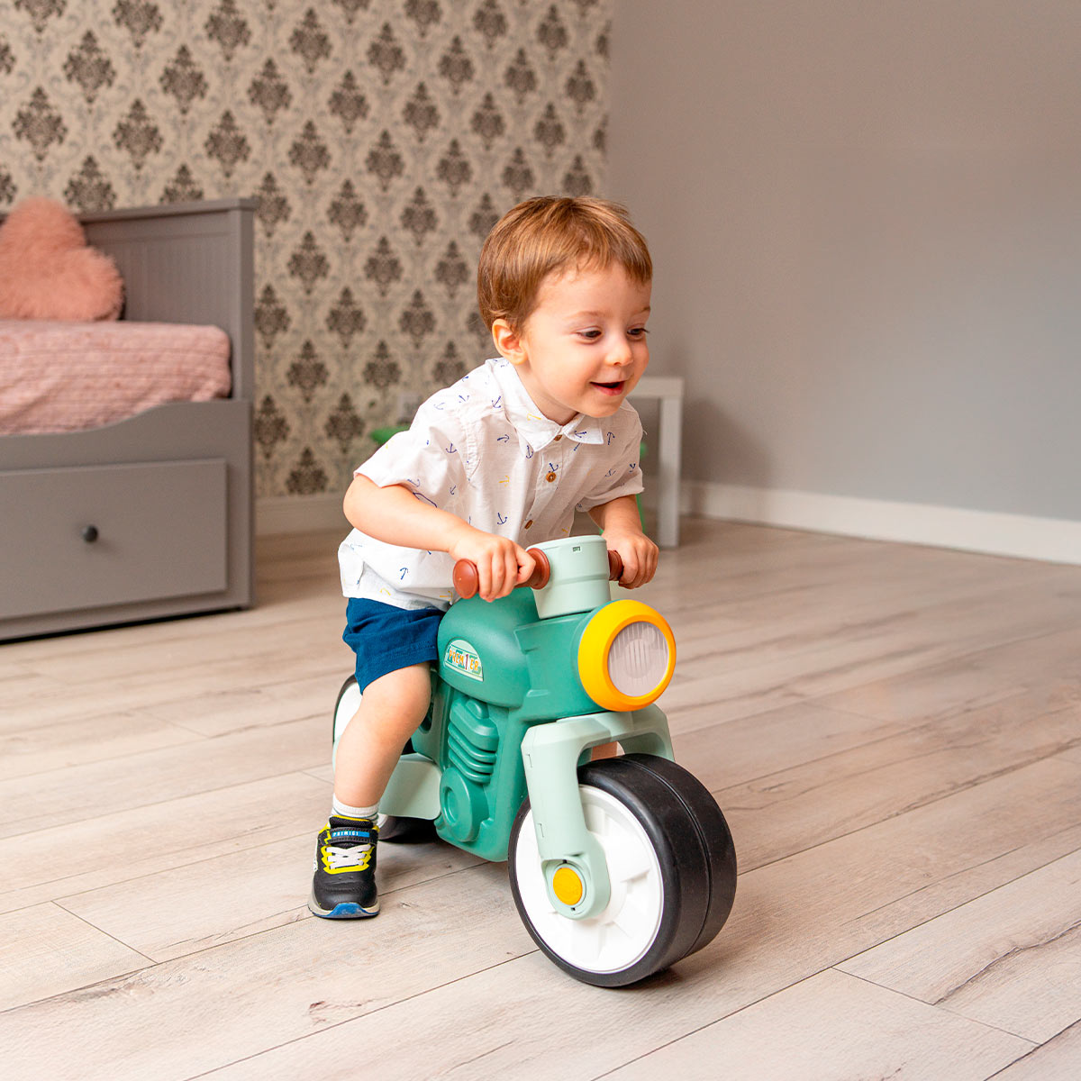 Gracias a sus ruedas anchas, silenciosas y antideslizantes, esta moto ofrece una gran estabilidad, ayudando a los niños a desarrollar su equilibrio y coordinación motora de forma segura. Además, sus ruedas no dejan marcas en el suelo, por lo que es perfecta tanto para uso en interiores como en exteriores.