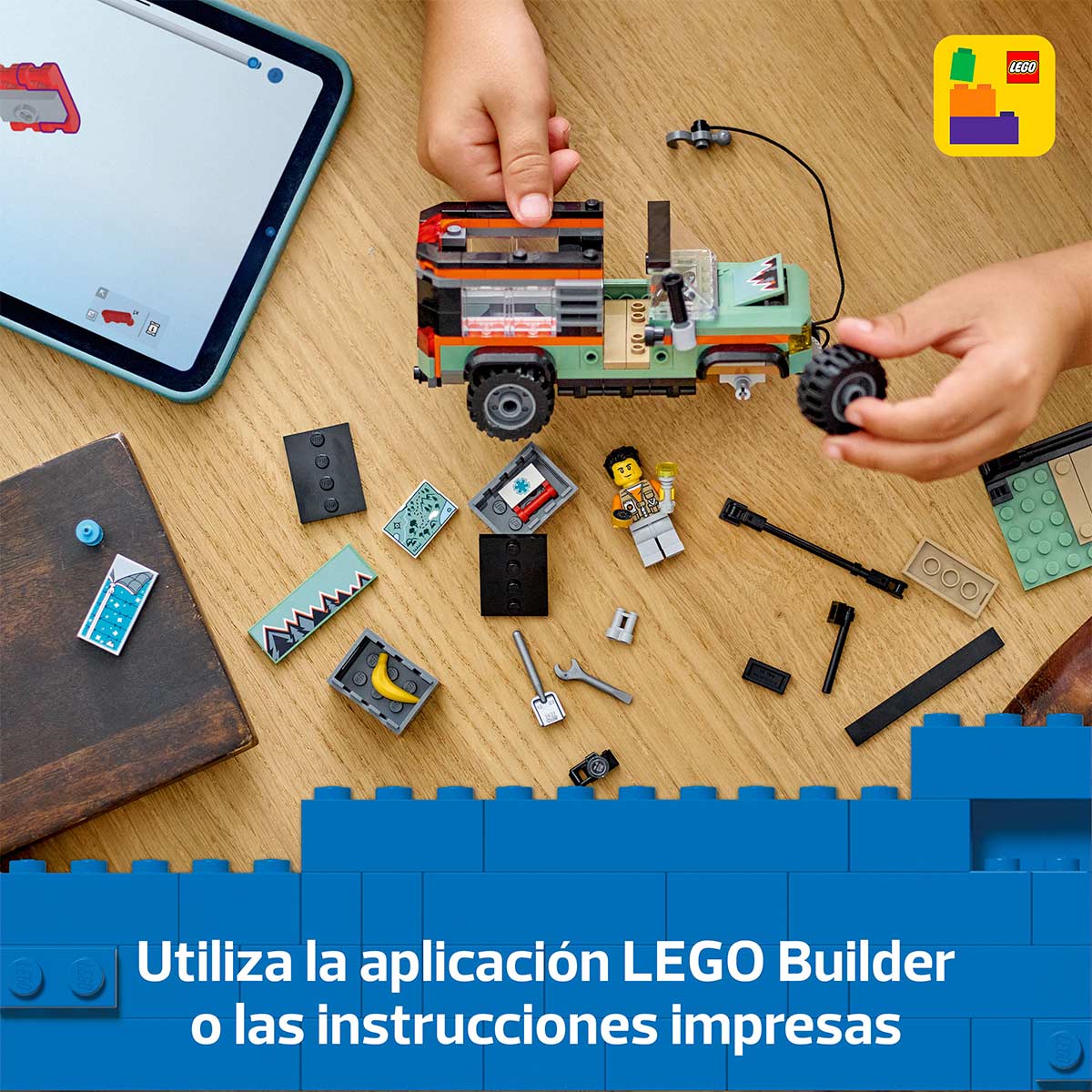 Este set con un todoterreno de juguete incluye una guía de construcción paso a paso impresa e instrucciones digitales en la app LEGO Builder, donde los niños pueden acercar y girar sus modelos en 3D, guardar sets y consultar su progreso mientras construyen.
