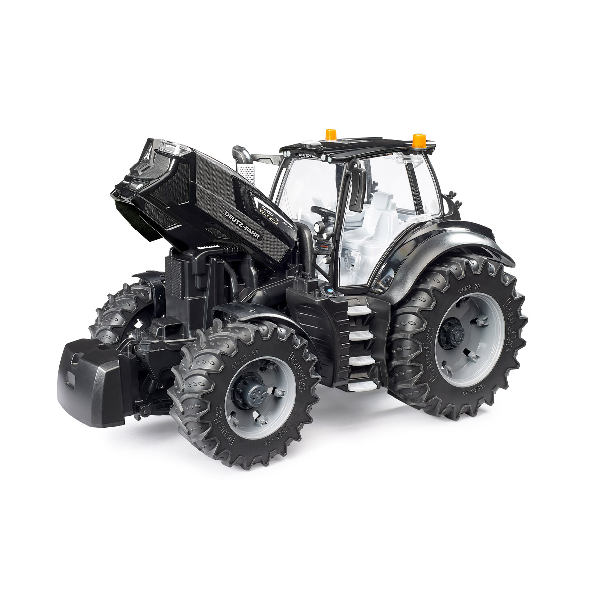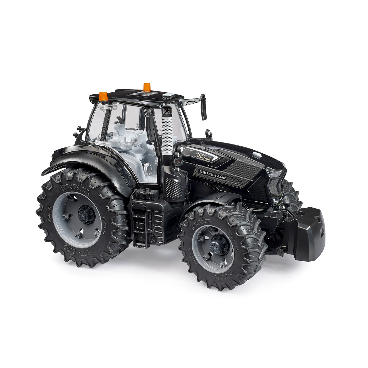 El Warrior, la exclusiva variante en color negro de este tractor, tiene un diseño particularmente fascinante. También por su funcionalidad y calidad, este nuevo modelo de BRUDER a escala 1:16 no tiene nada que envidiar al original, tal y como dice el lema: ¡Igual que en la vida real! La cabina del conductor está completamente acristalada y las puertas se pueden abrir fácilmente. El capó de motor abatible puede abrirse para ver el motor. Su sencilla maniobrabilidad es posible gracias al eje oscilante integrado y a la prolongación del volante, que puede introducirse a través del techo corredizo. Para ampliar este modelo se puede montar un cargador frontal (n.º de art. 03333). Las ruedas desmontables hacen que resulte aún más divertido jugar con este tractor. La ampliación mediante el set de figuras de taller (n.º de art. 62100) eleva aún más el valor lúdico de este tractor. No hay ni que decir que todos los remolques y aperos agrícolas de la casa BRUDER combinan muy bien con esta auténtica joya de tractor en color negro.
